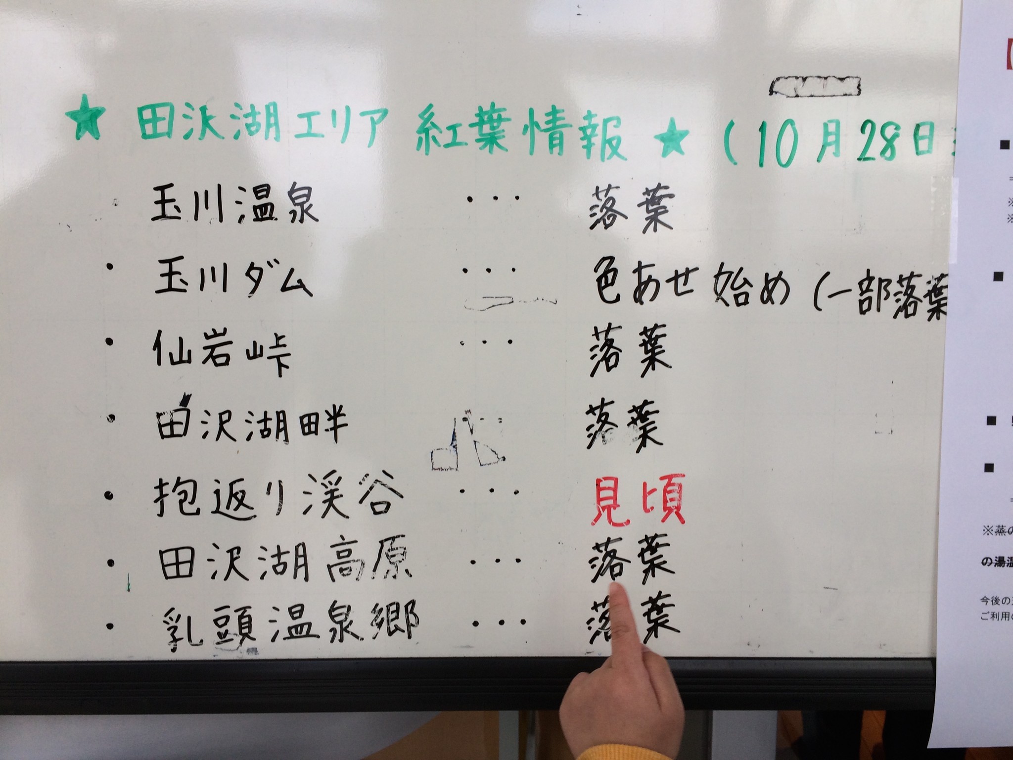 現實總是殘酷的,田澤湖車站貼出來的告示指出,這附近的紅葉景點只剩抱返的溪谷,但總比只見枯枝落葉來得幸福。(那隻肥肥的手是陳小弟的)