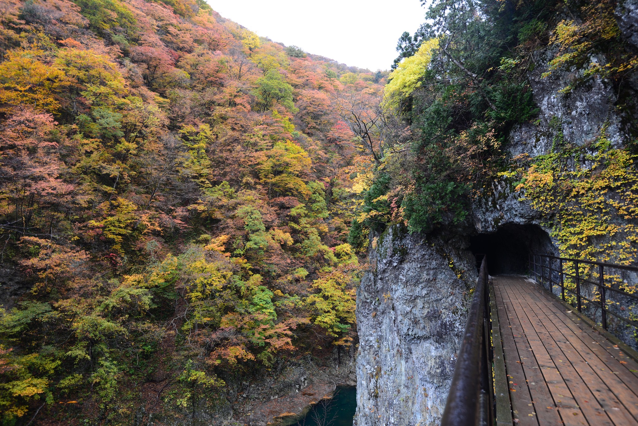 誓願橋附近的手鑿隧道是這條散步道的另一重點,隧道內陰暗狹小,出來後柳暗花明,對岸的萬紫千紅煞是壯麗!