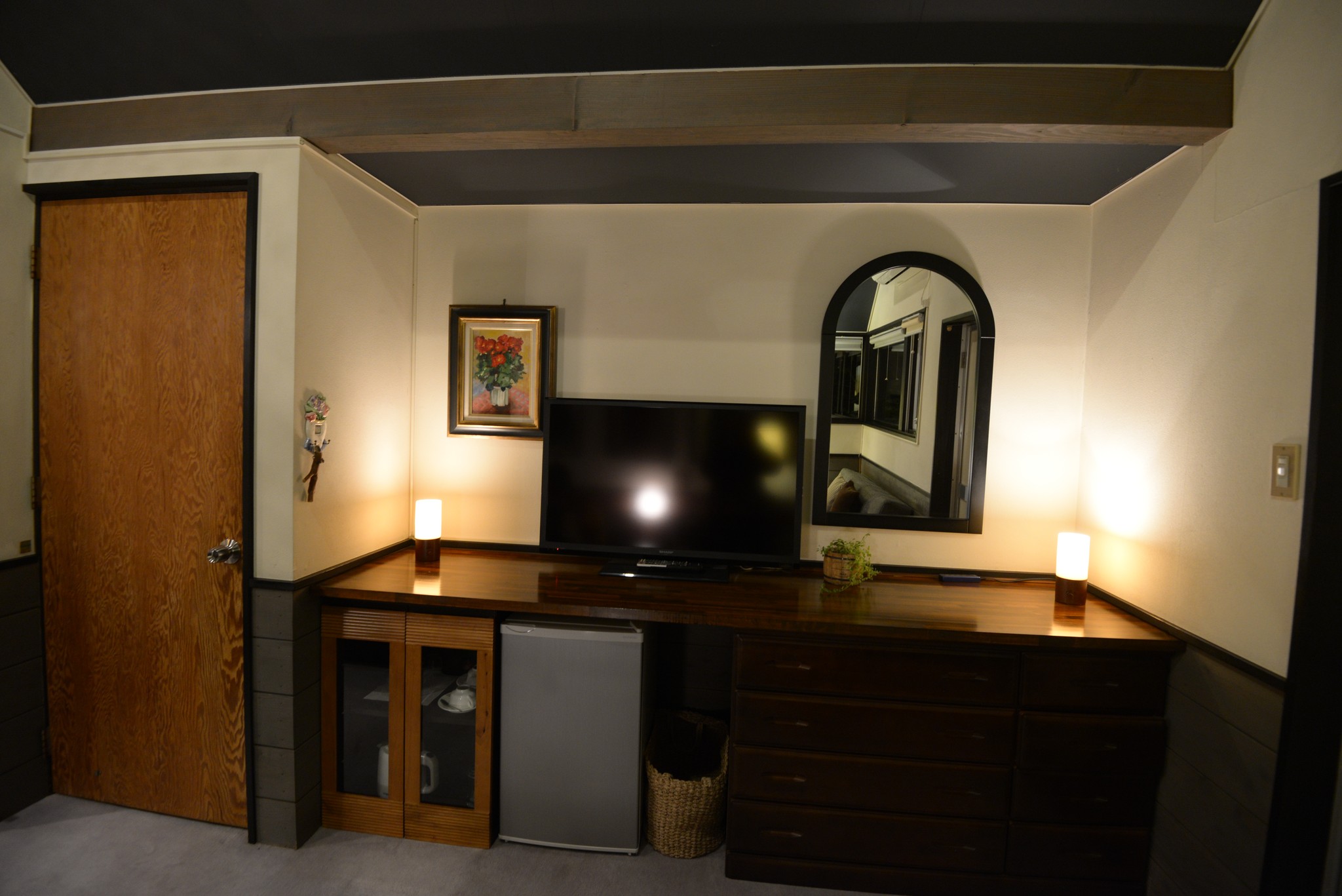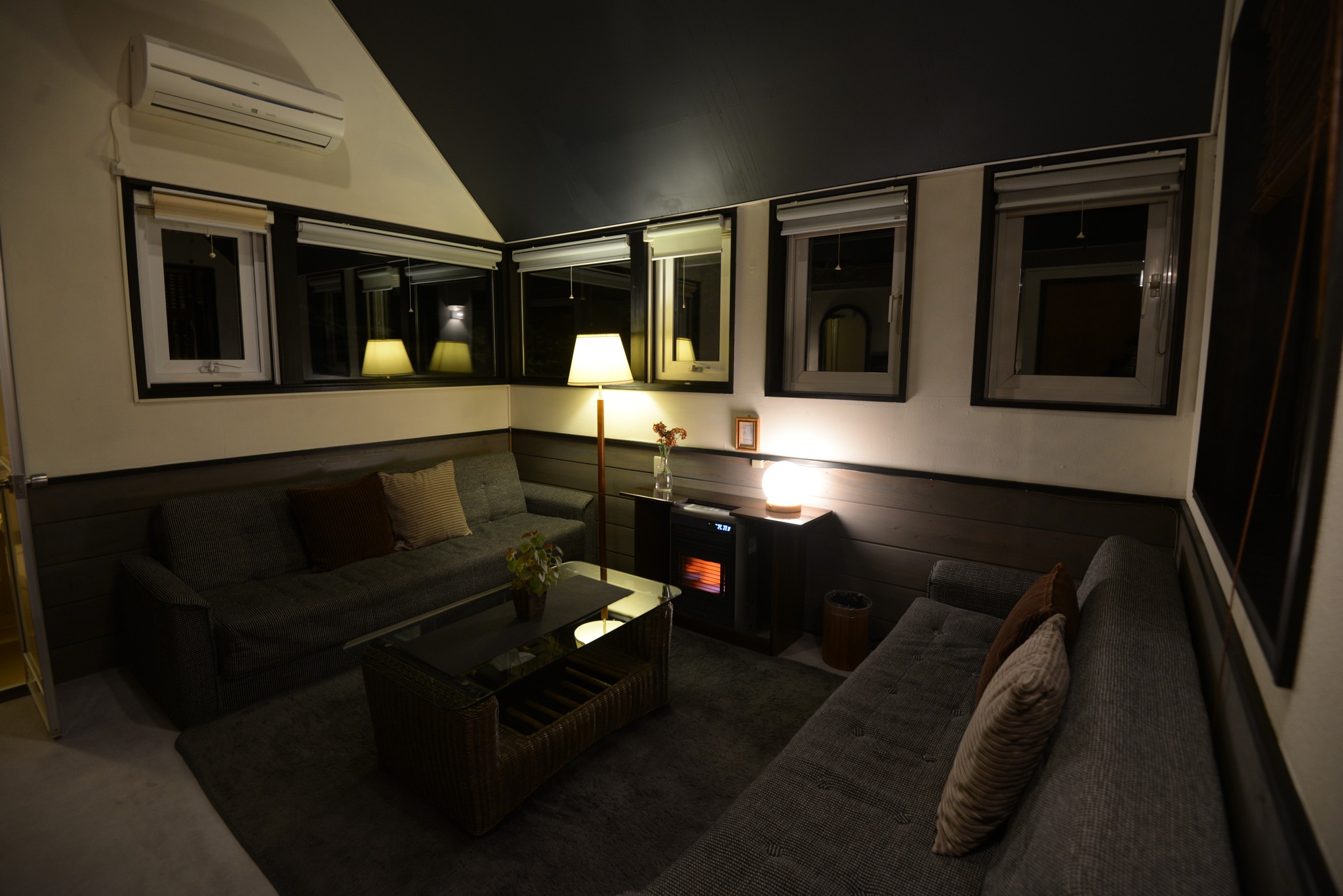 這晚的住宿在二樓 202 號房,看起來有些年紀的男主人堅持幫我們搬行李讓我有些不好意思。201 與 202 室都是セパレートルーム房型,有八疊的客廳與六疊的臥室所組成,也只有這個房型有衛浴,其他的三間客房共用浴室,男女的浴室有分開。先來看看客廳,這一側是斜屋頂,主人家早已幫我們把暖氣開得暖呼呼,兩側的沙發是沙發床,所以這個房型最多是可以住到四人。