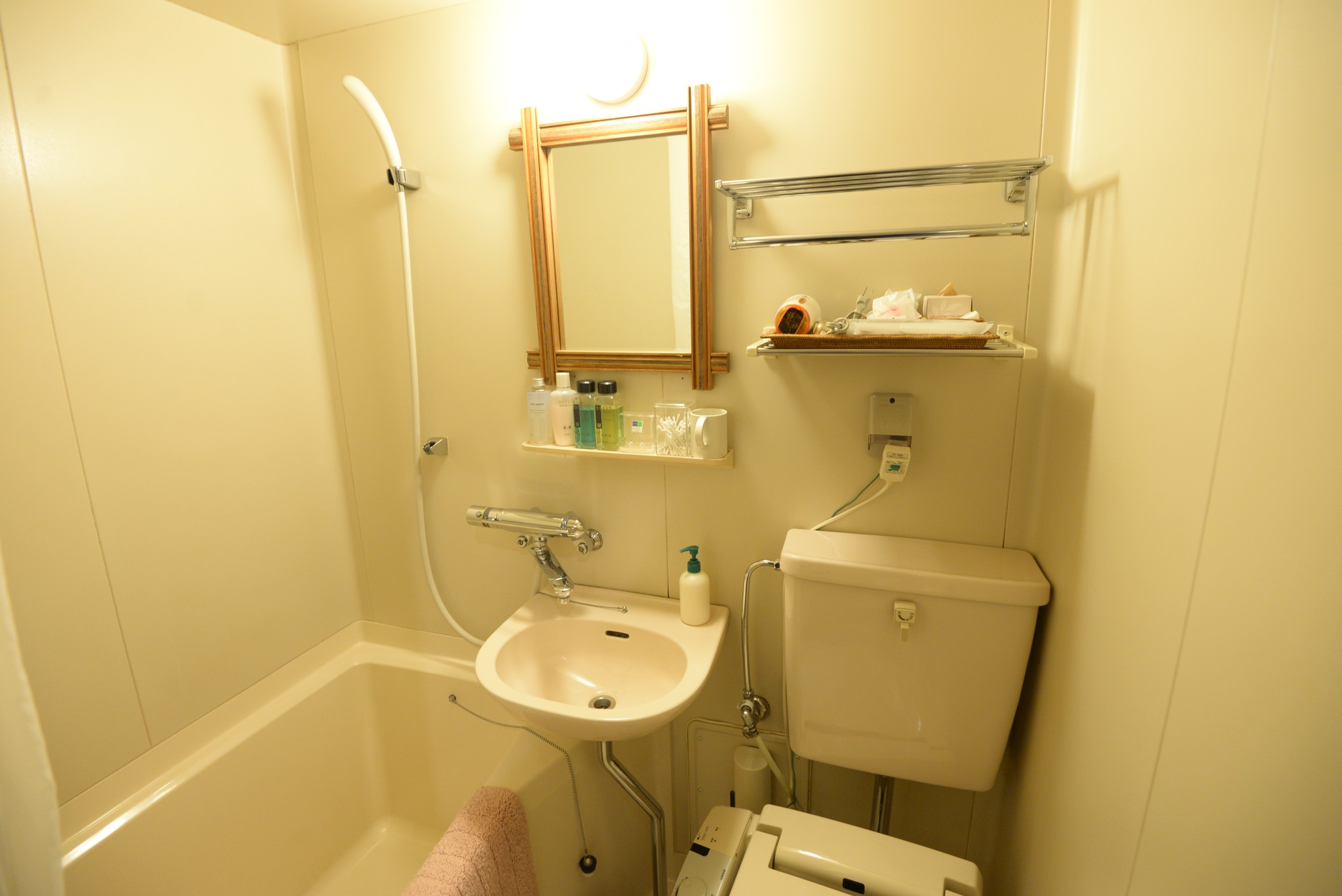房內有一系統浴廁,是日本商務旅館常見的那種。again,洗屁屁機一定不會少!這天只有我們一組客人,我們當然是到樓下洗又寬又大的浴室,男生的共用浴室內還有洗衣與乾衣機,真是太後悔沒先查清楚,我們前幾天的髒衣服還留在仙台的飯店行李箱內發酸發臭勒!