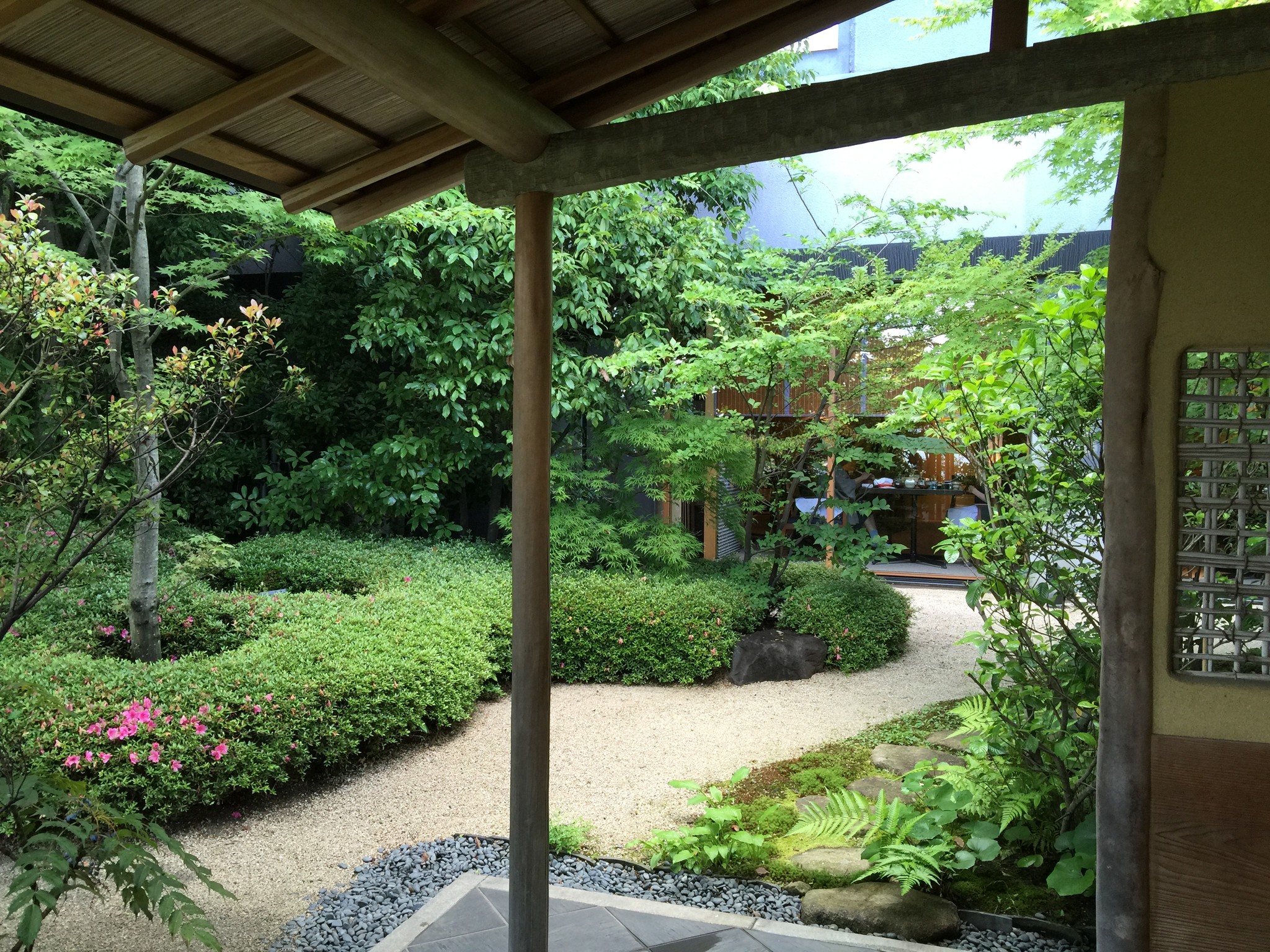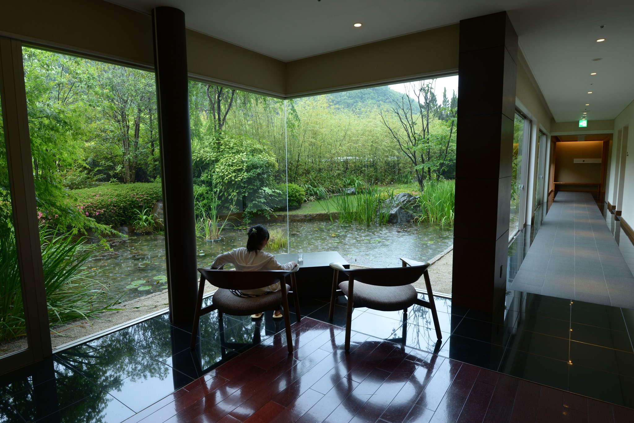 往 Japanese Dining SOBO 長廊外的庭園造景在雨中特別有詩意,旅館特別放上桌椅可以讓人在此靜靜的欣賞。