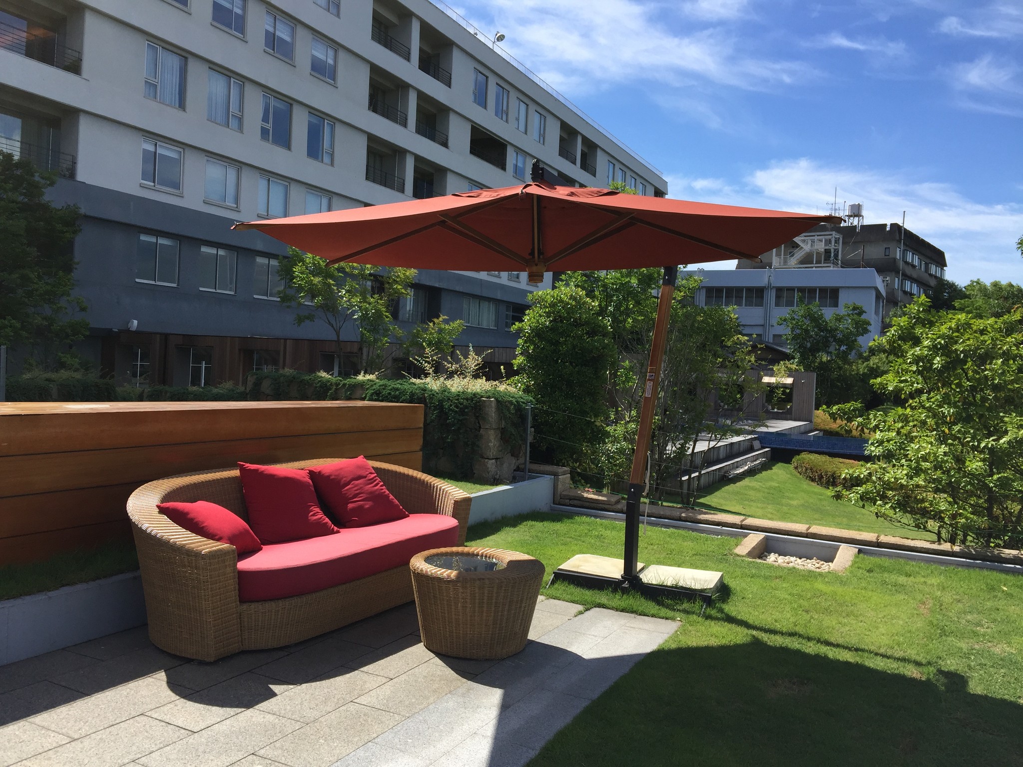 SPA 區上方的空間巧妙的設計草皮與陽傘,讓你不覺得下頭也是建築物的一部分還可以泡澡,後方的主建築就是