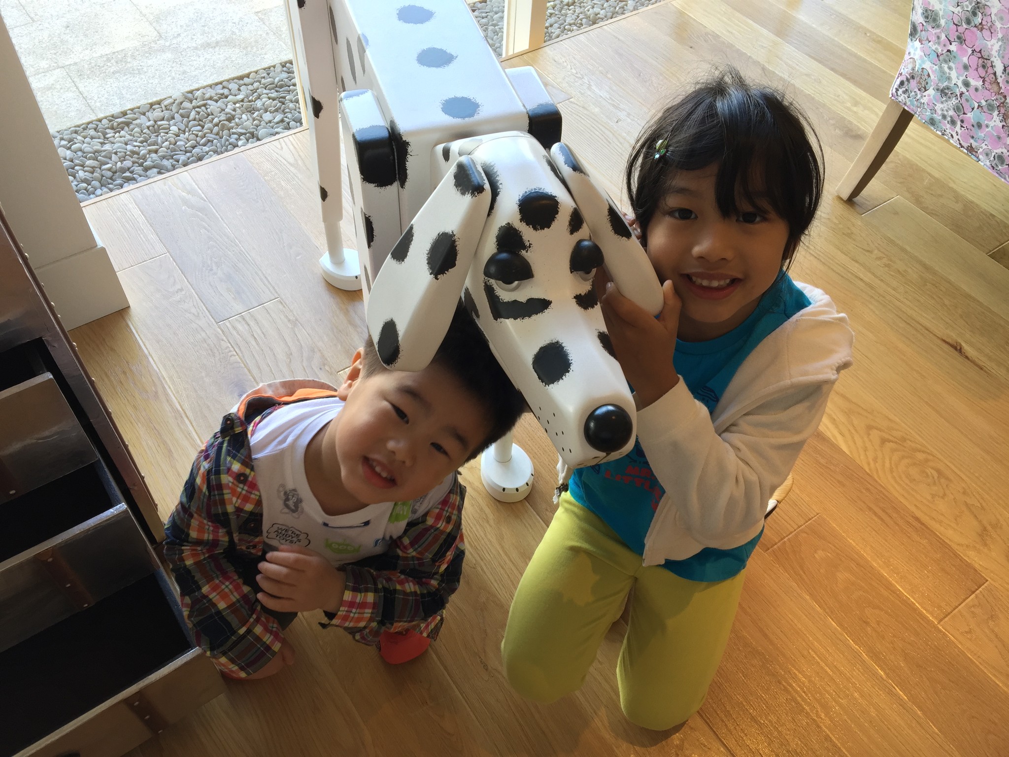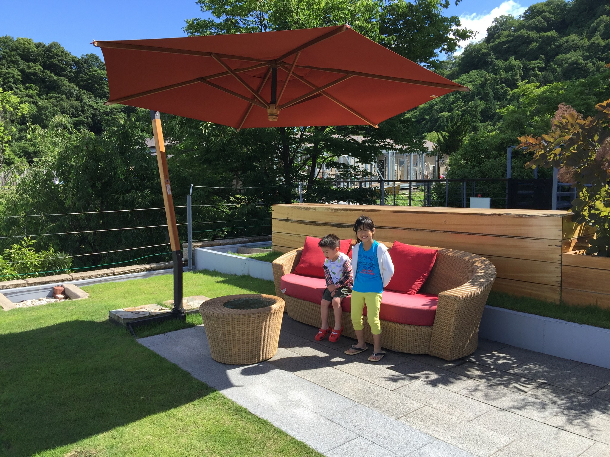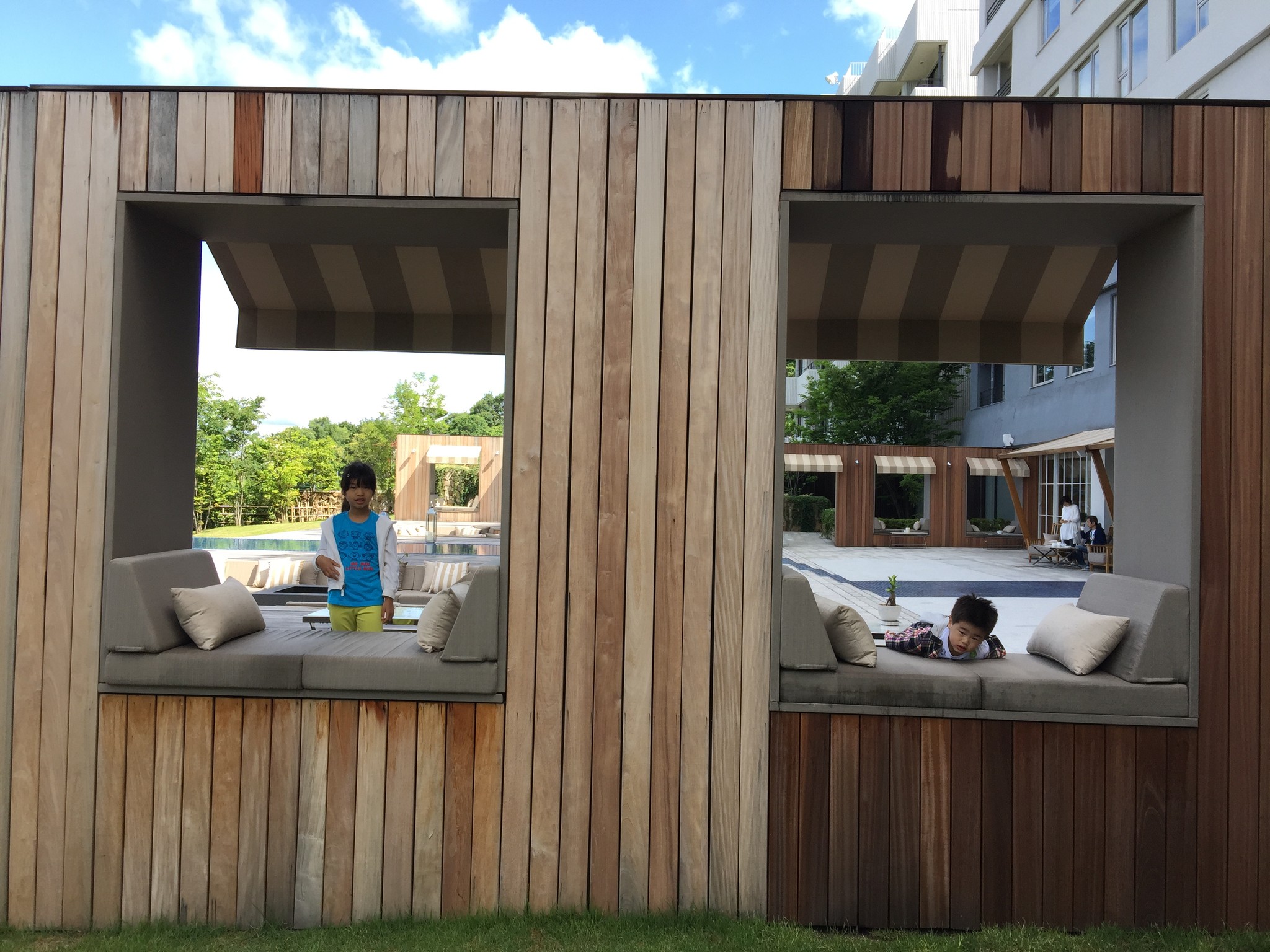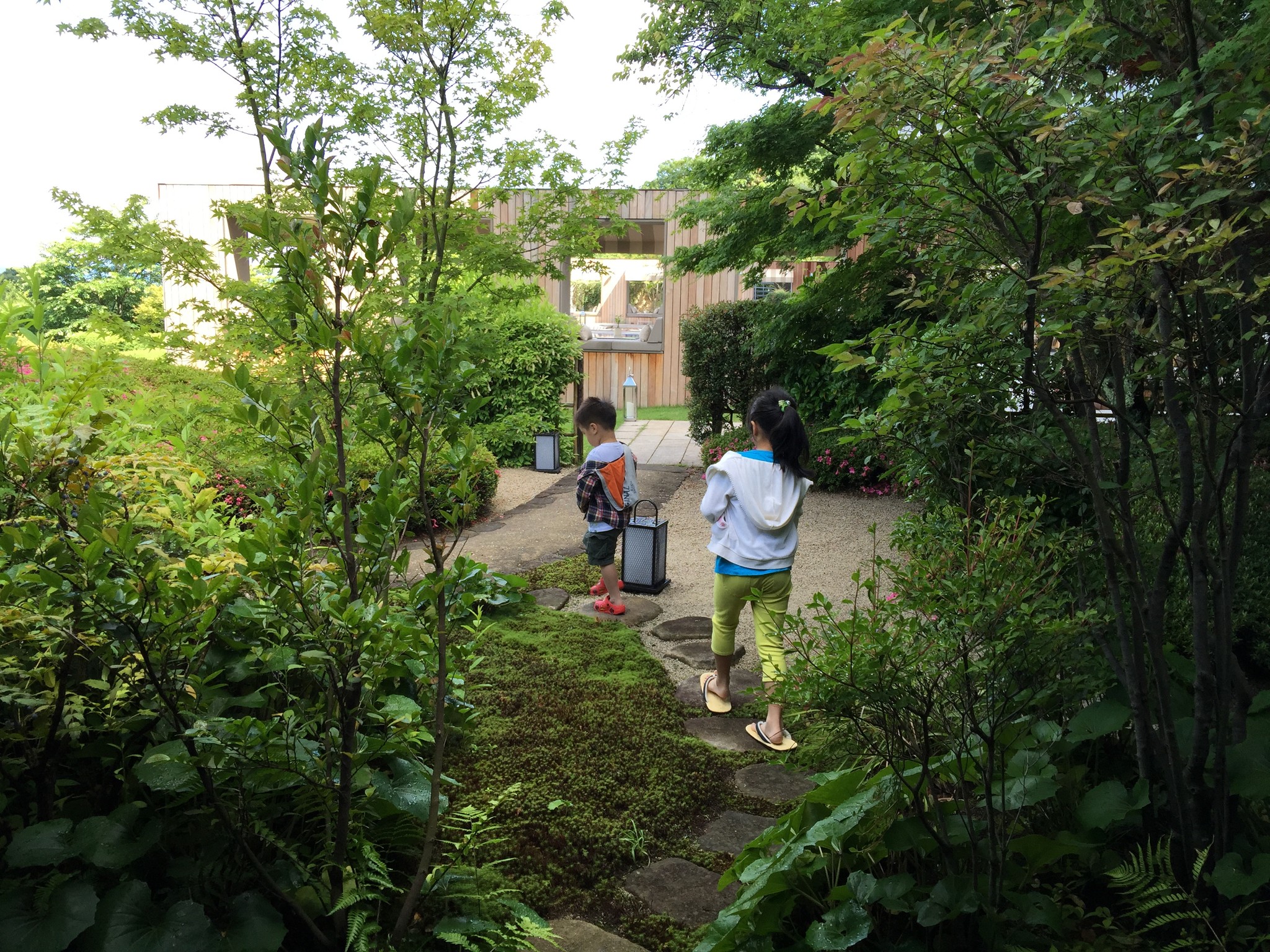 隔天起床後天氣終於放晴了,趁著大清早帶著兩小到庭園逛逛,先從上方的 ザ・デッキ THE DECK 走走。