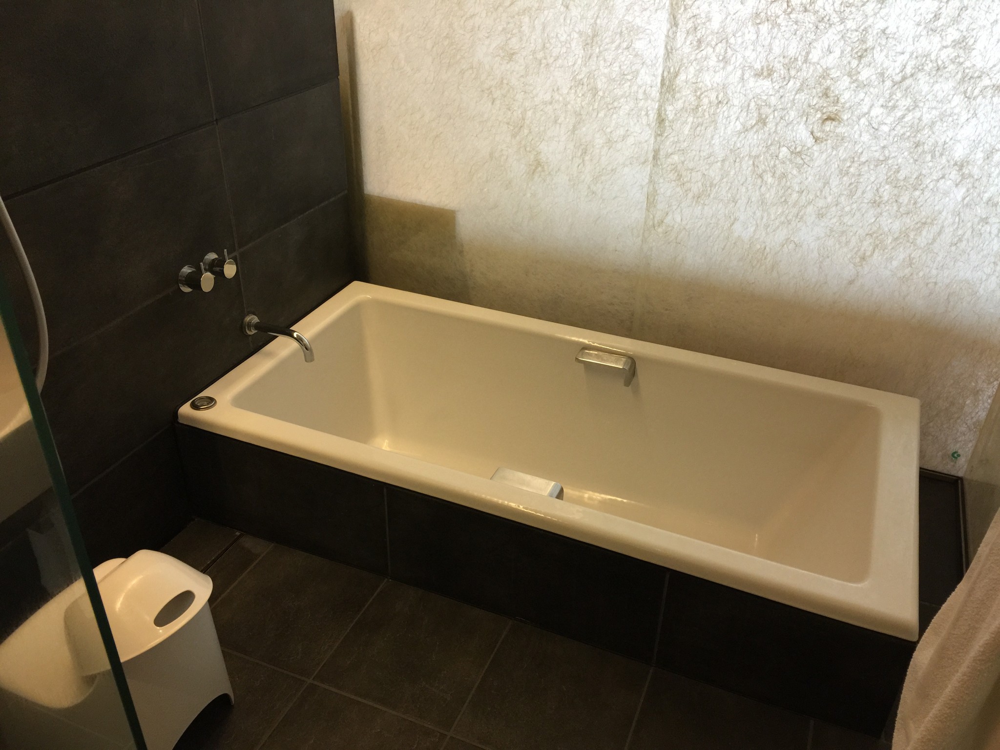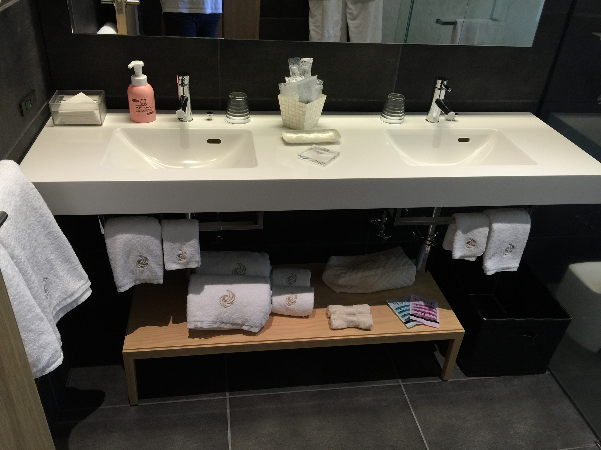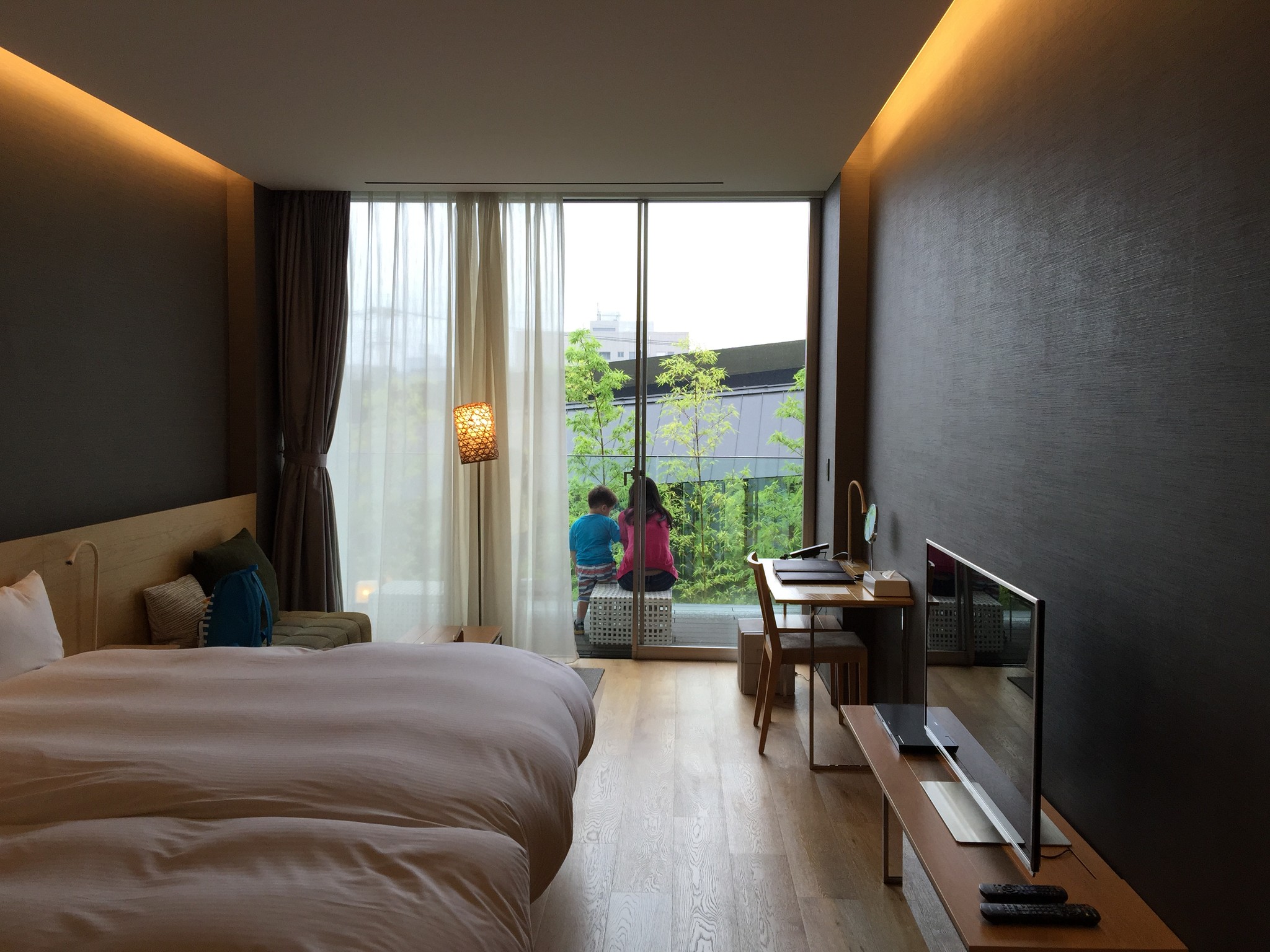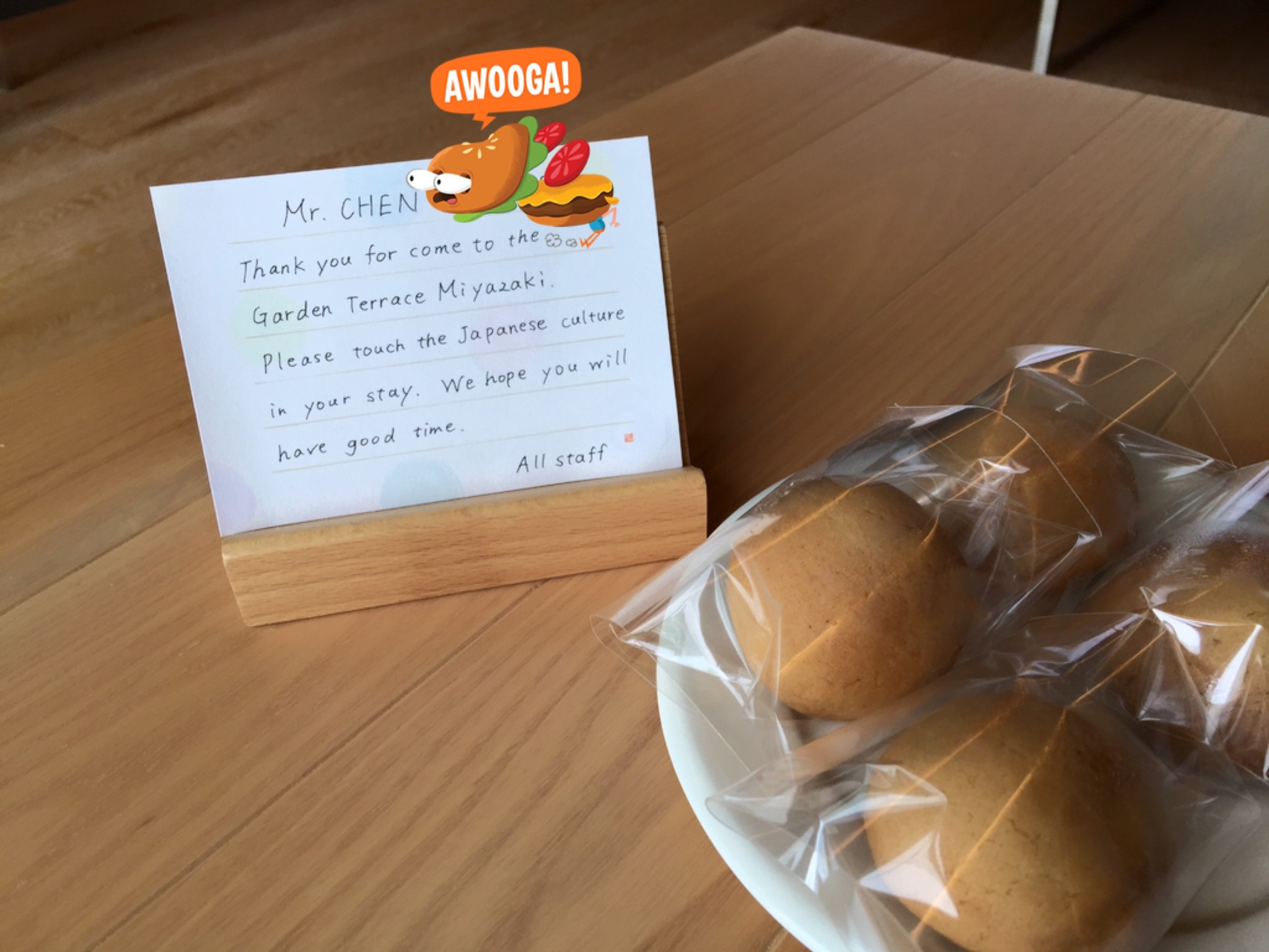 辦理完入住手續後,服務人員領著我們進房,簡單介紹房內設施後就離開。這回我們預定的是價格最低的標準雙人房(40.91平米),兩位小朋友利用小學生以下添い寝無料(跟大人一起睡,無額外寢具食物)的方案,但旅館方面 welcome 點心很貼心地準備四份,正當我們開心地吃著小饅頭時,領我們進門的服務生來按門鈴,她拿了兩組小朋友的室內備品(拖鞋小毛巾牙刷牙膏)以及嬰兒泡泡沐浴乳給我們,真不愧是一休與 TripAdvisor 宮崎市區排名第一的旅館,真實地感受到館方的誠意。