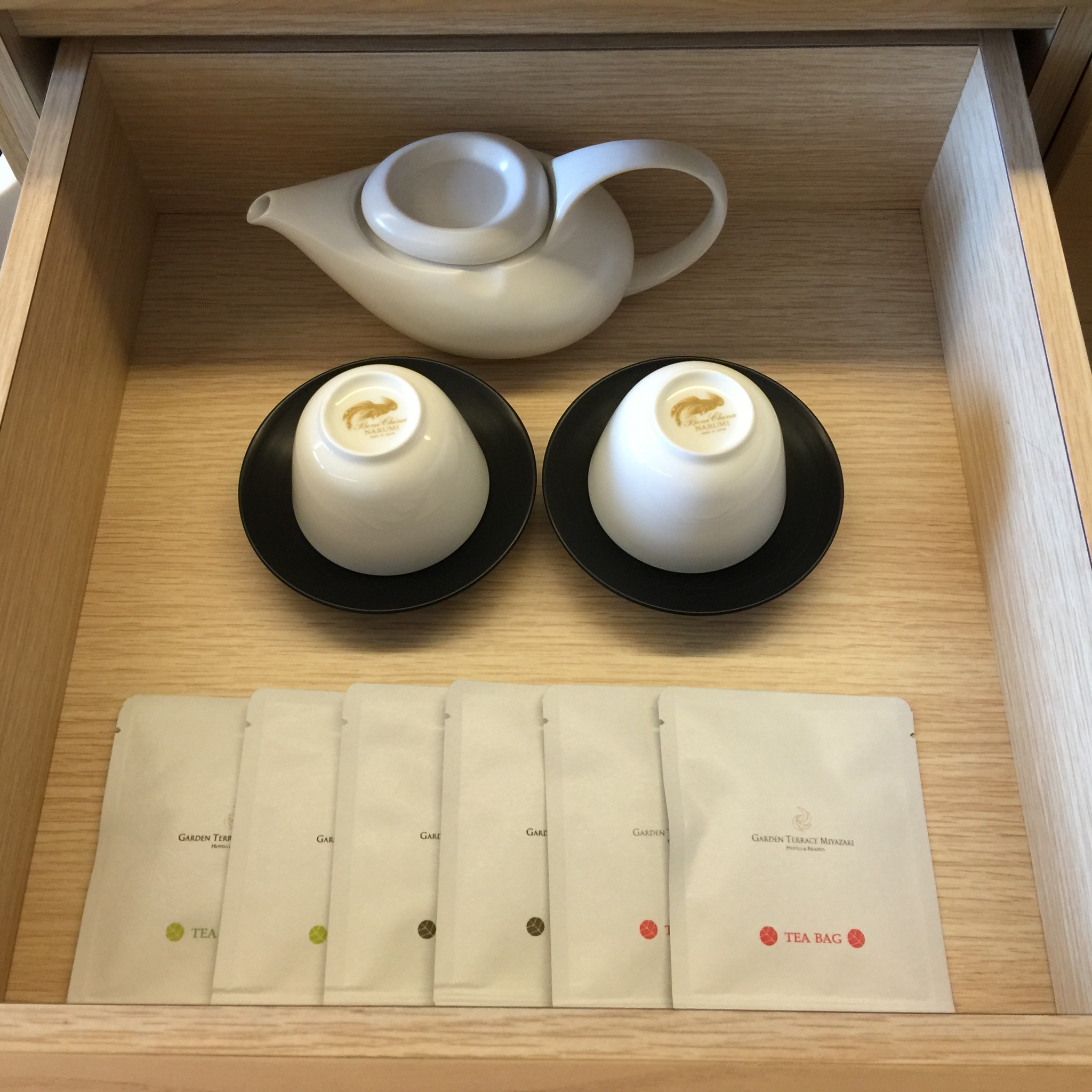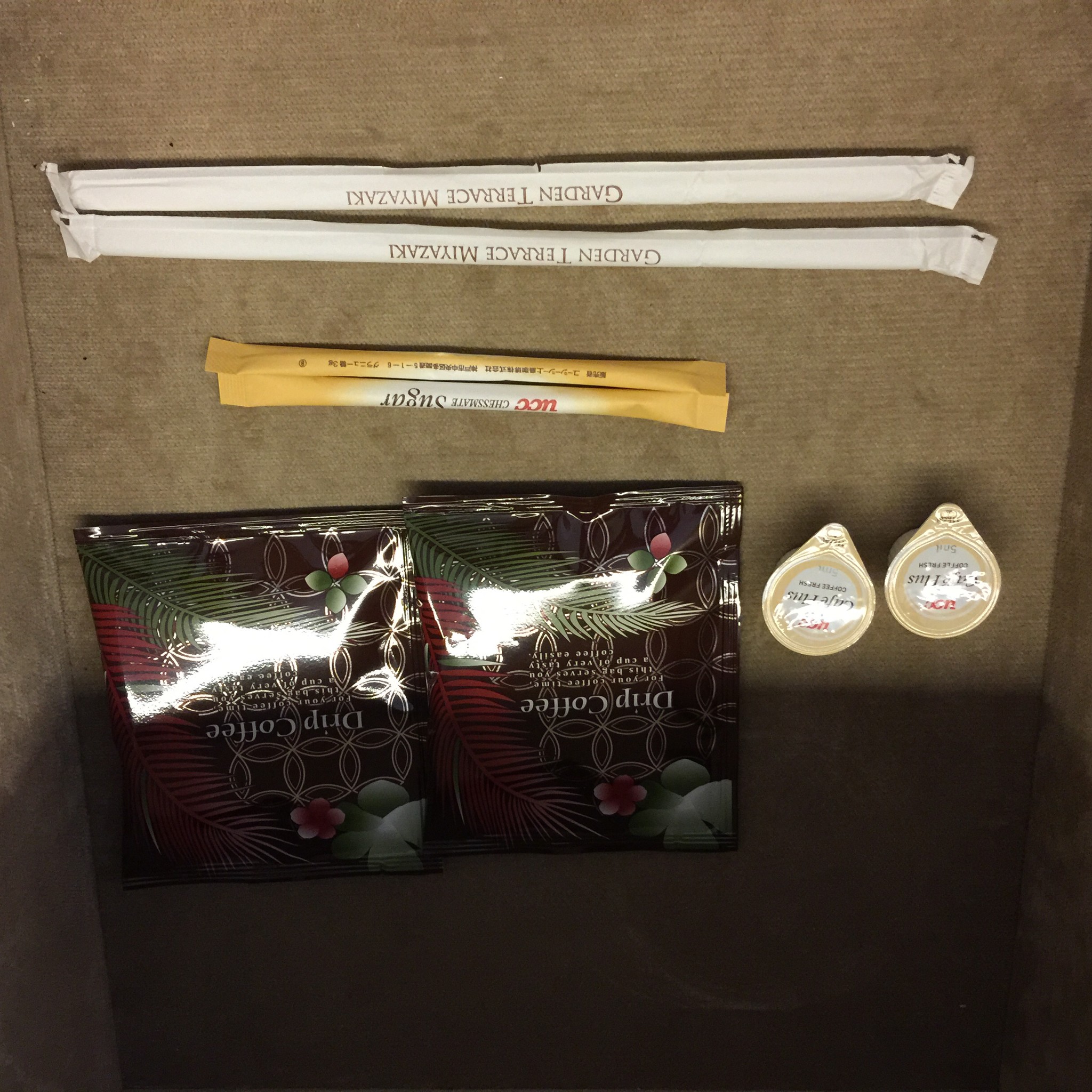 果真在滂沱大雨中抵達 Garden Terrace Miyazaki,服務人員接過行李後帶我們直接上二樓的クラブラウンジ バーラウンジ(酒 bar)辦理 check-in,而我們的熊本熊車就由服務人員接走,爾後如要拿車也是跟服務人員講一聲,他會幫你把車子從停車場開來門口給你。check-in 流程承襲日式旅館的傳統,服務人員蹲著與你對談,讓自己的高度略矮於住房的客人,當然 welcome drink 一定少不了,還會請住房的女性選擇一款精油擴香,服務人員會佈置在房間中。
