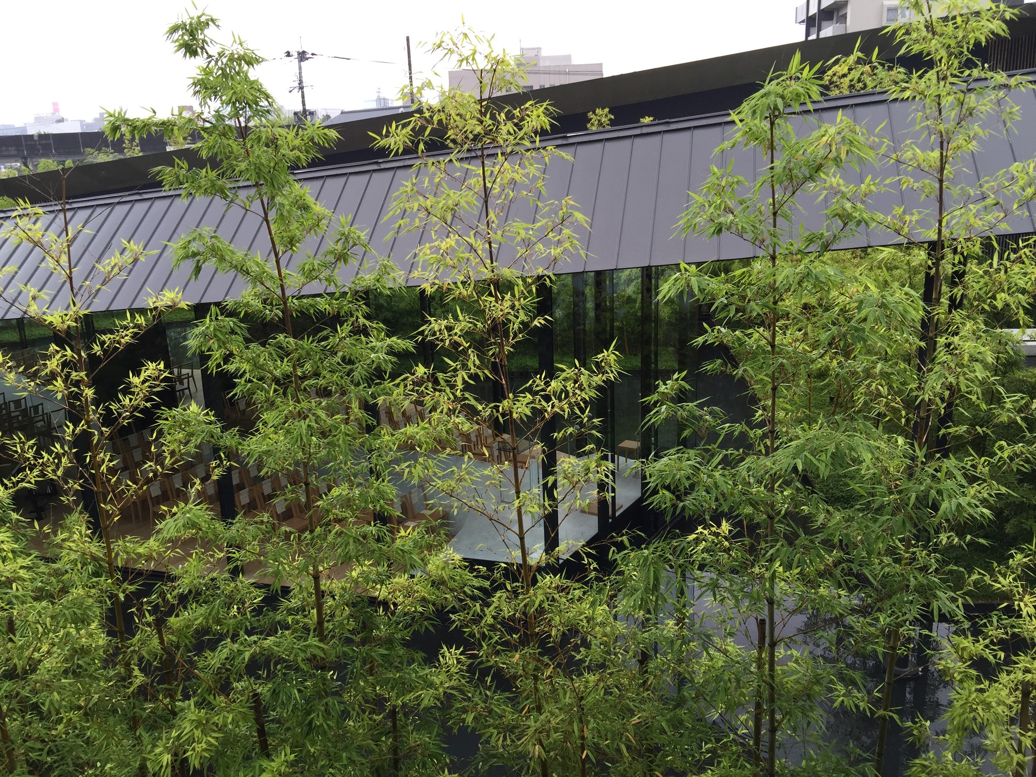 從陽台望向中庭的教堂,隈研吾巧妙的利用竹林改善狹小的腹地,同時具備開放感與隱蔽性。不時有火車經過外頭的高架鐵路(左上角過曝的電桿),那感覺真的很妙。
