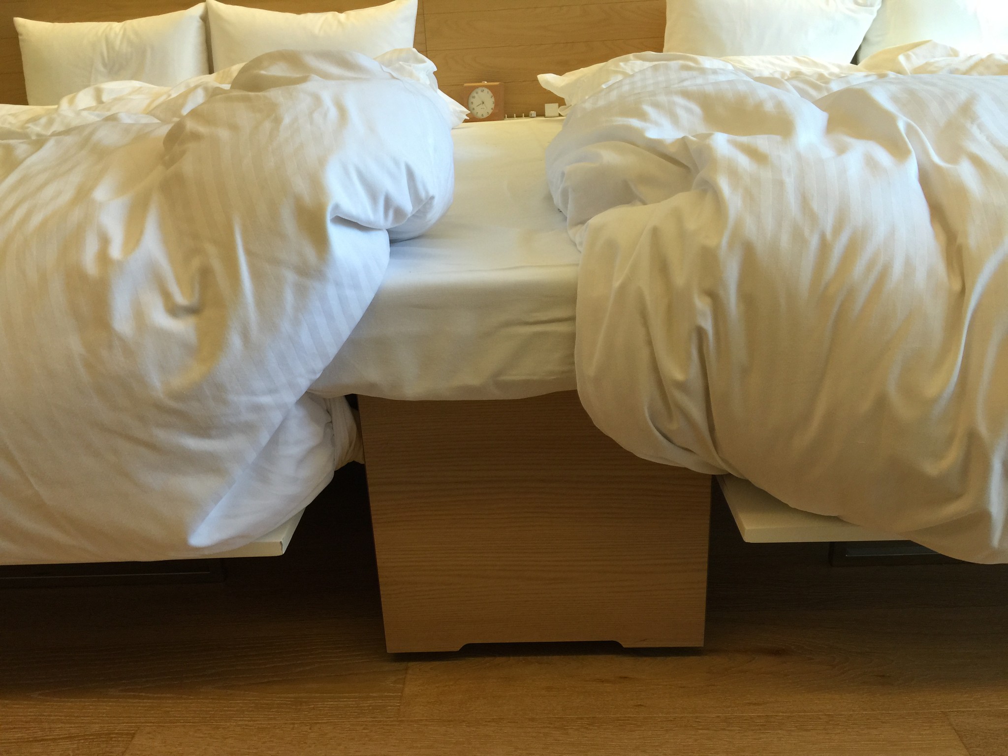 另一個貼心的地方,大家有看到了嗎?因為有小朋友添寢,館方特別將兩張床間的走道補上延伸床墊,床墊上頭平整到讓你感覺似乎只有一張超大的床,兩小孩在上頭滾來滾去都沒問題。