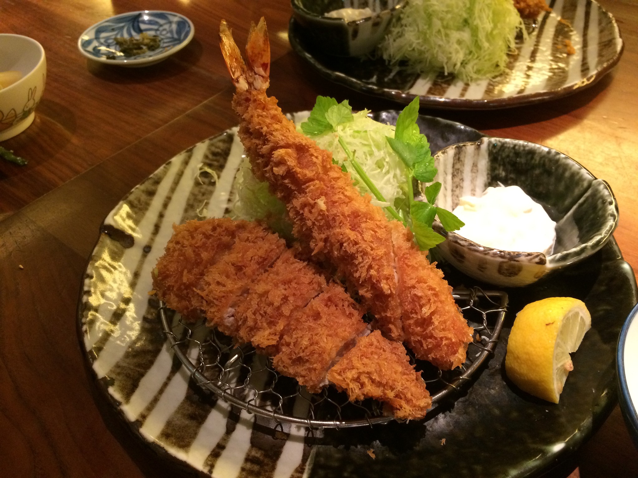 新鮮現炸的炸蝦與炸豬排在視覺上成了最美的風景,炸豬排咬下去鮮嫩多汁,吃得到豬肉的香氣。炸蝦外層酥脆,內層Q彈香甜,海陸一整個大滿足。份量與『名代とんかつ かつくら』的『名物 かつくら膳』差不多,美味程度也在伯仲之間,但價格就差了一大截!