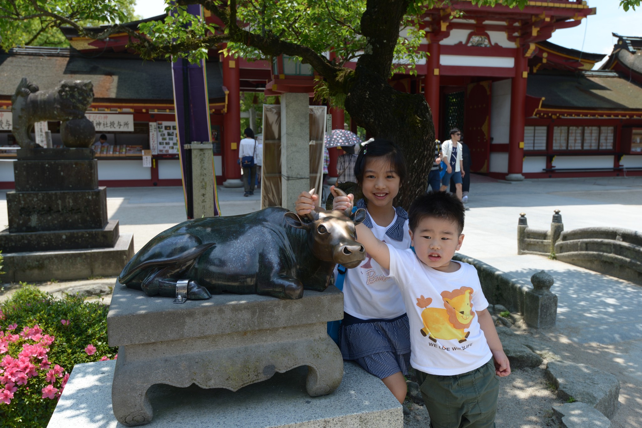 京都的北野天滿宮與九州的太宰府天滿宮、山口縣的防府天滿宮為日本三大天滿宮,所祭拜的是日本學問之神:菅原道真,剛好趁這次帶今年準備上小一的元氣妞來拜一下學問之神,希望她的小學新生活可以開心快樂又順利,還有今年度也要上幼稚園的無敵兔能開心上學。