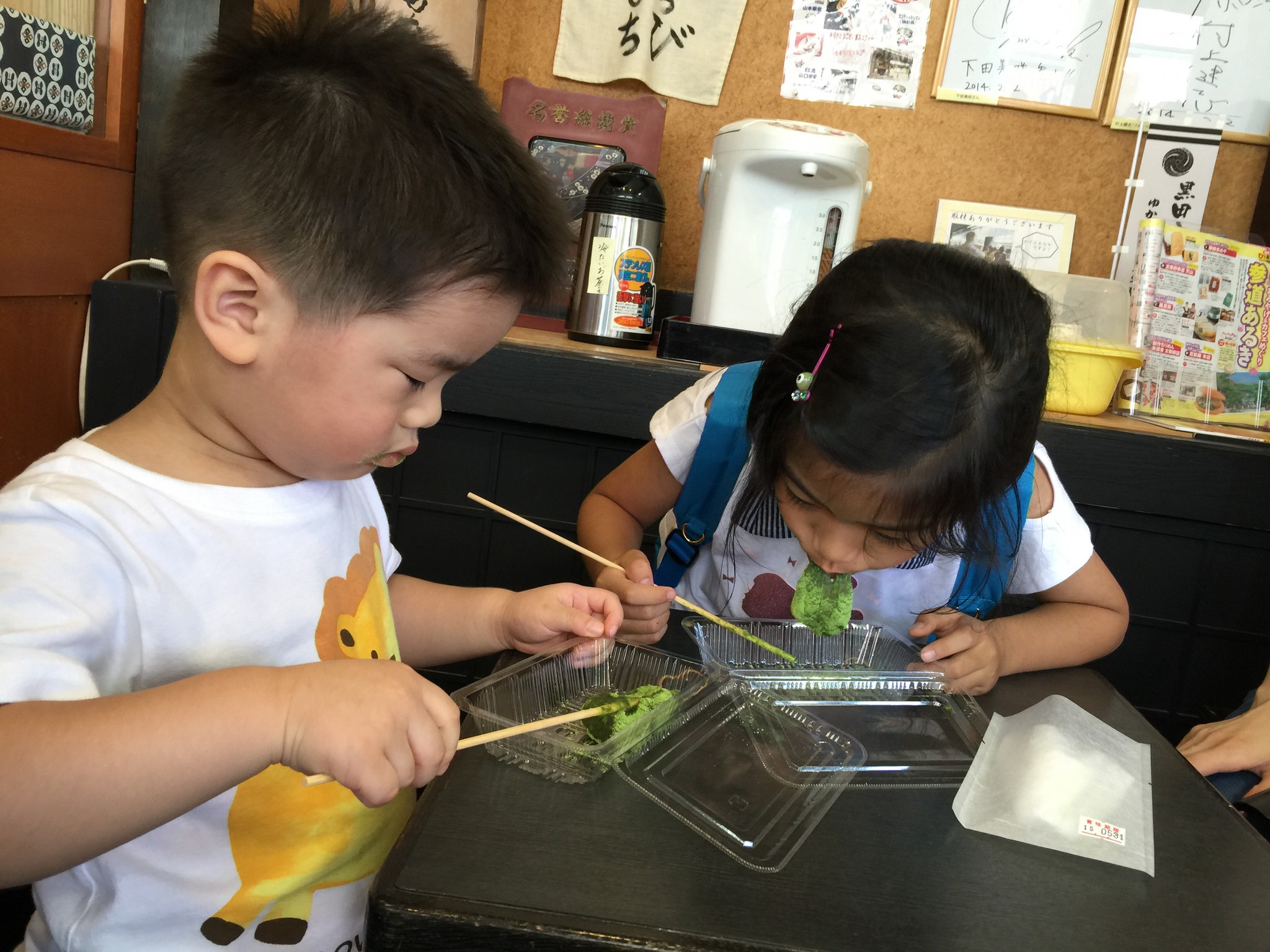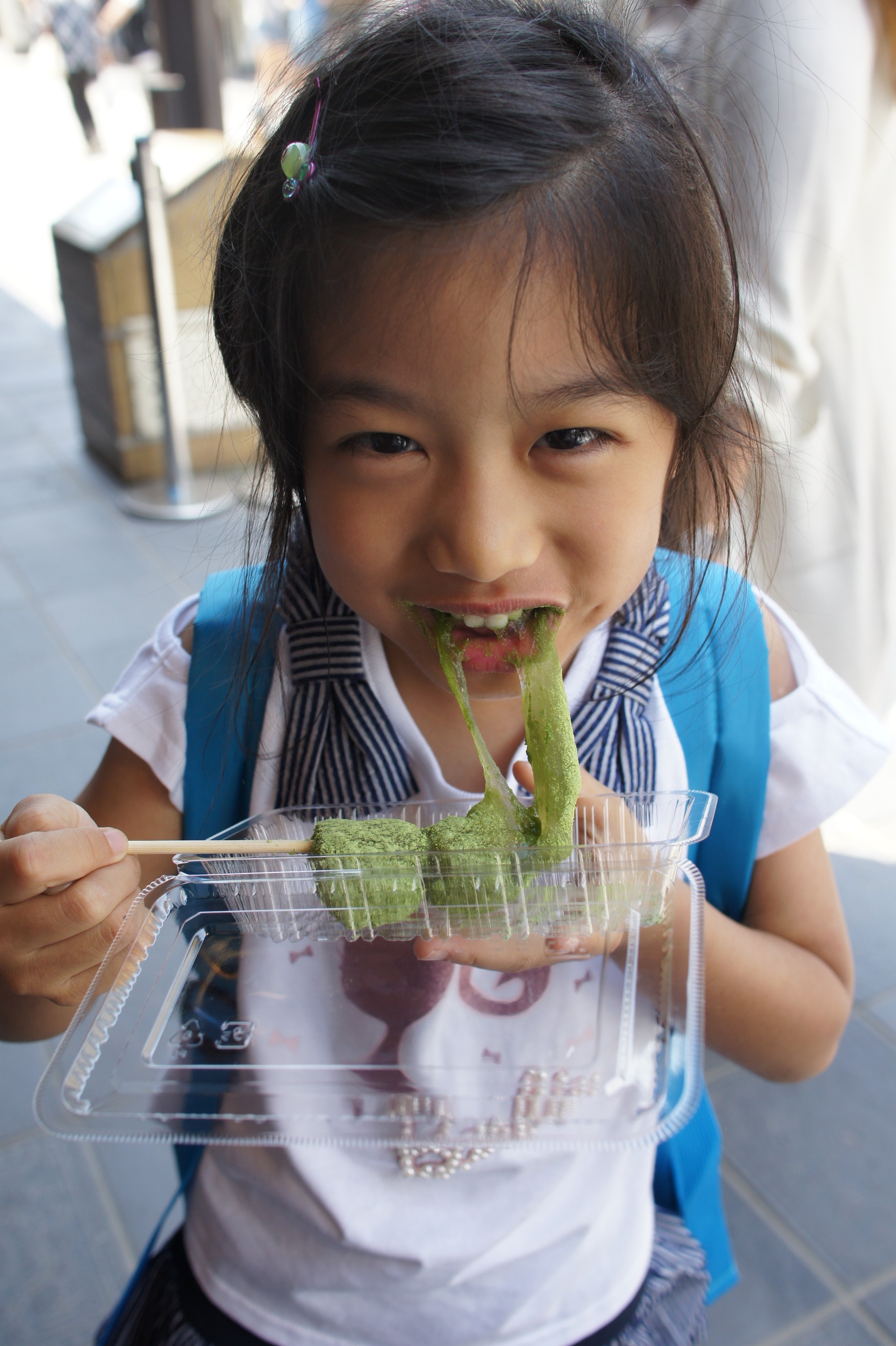 兩種現做的點心都是選抹茶口味的,小姐很開心吃了起來啦,愛吃到還要再買一根蕨餅來吃