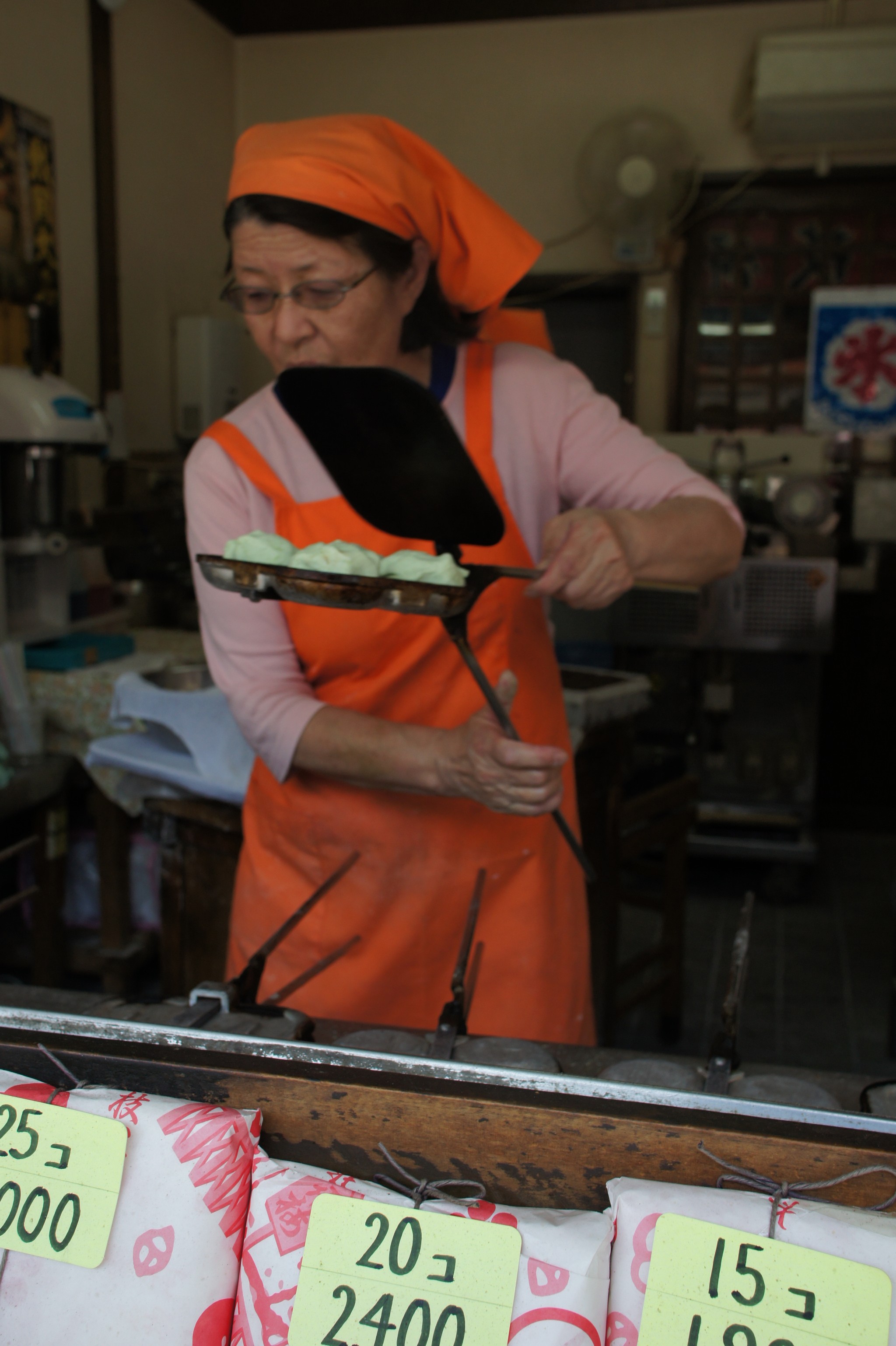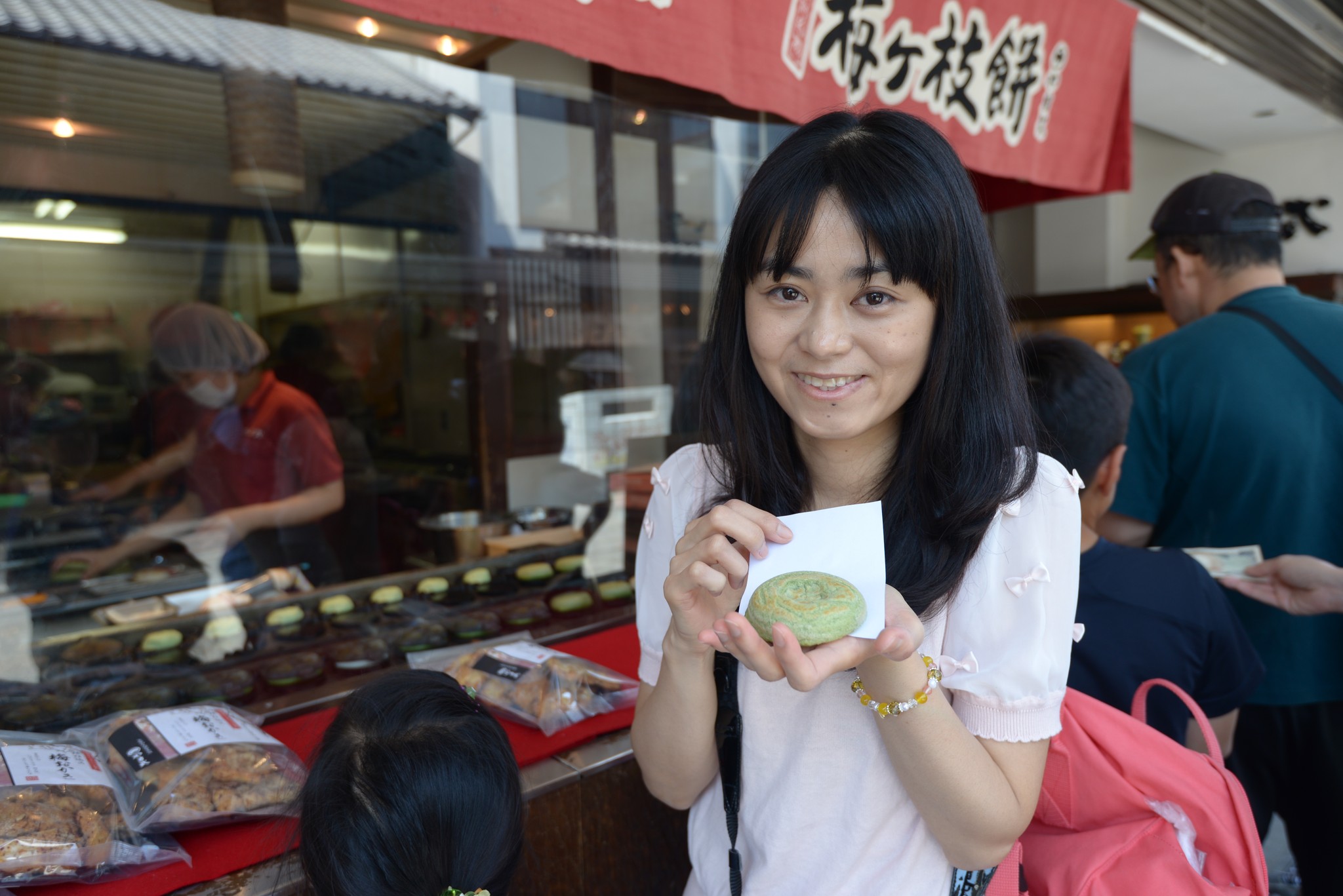 葛蘭發現一家梅ヶ枝餅排著長長的人龍,好奇心被挑起,就說要排隊買來吃吃看