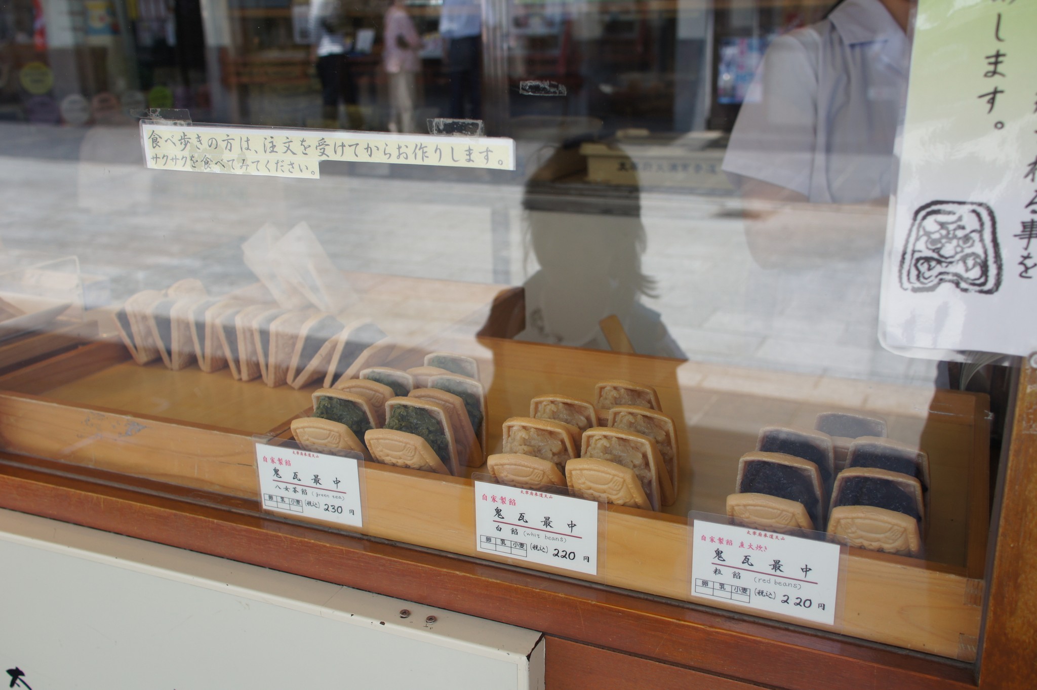 趁著葛蘭排隊的空擋,我帶著元氣妞去走走逛逛,逛到這家"天山",這個"鬼瓦最中"好像很好吃耶,裡面包的餡有手亡豆(扁豆,就是白餡),小豆(紅豆),最吸引我的就是抹茶啦