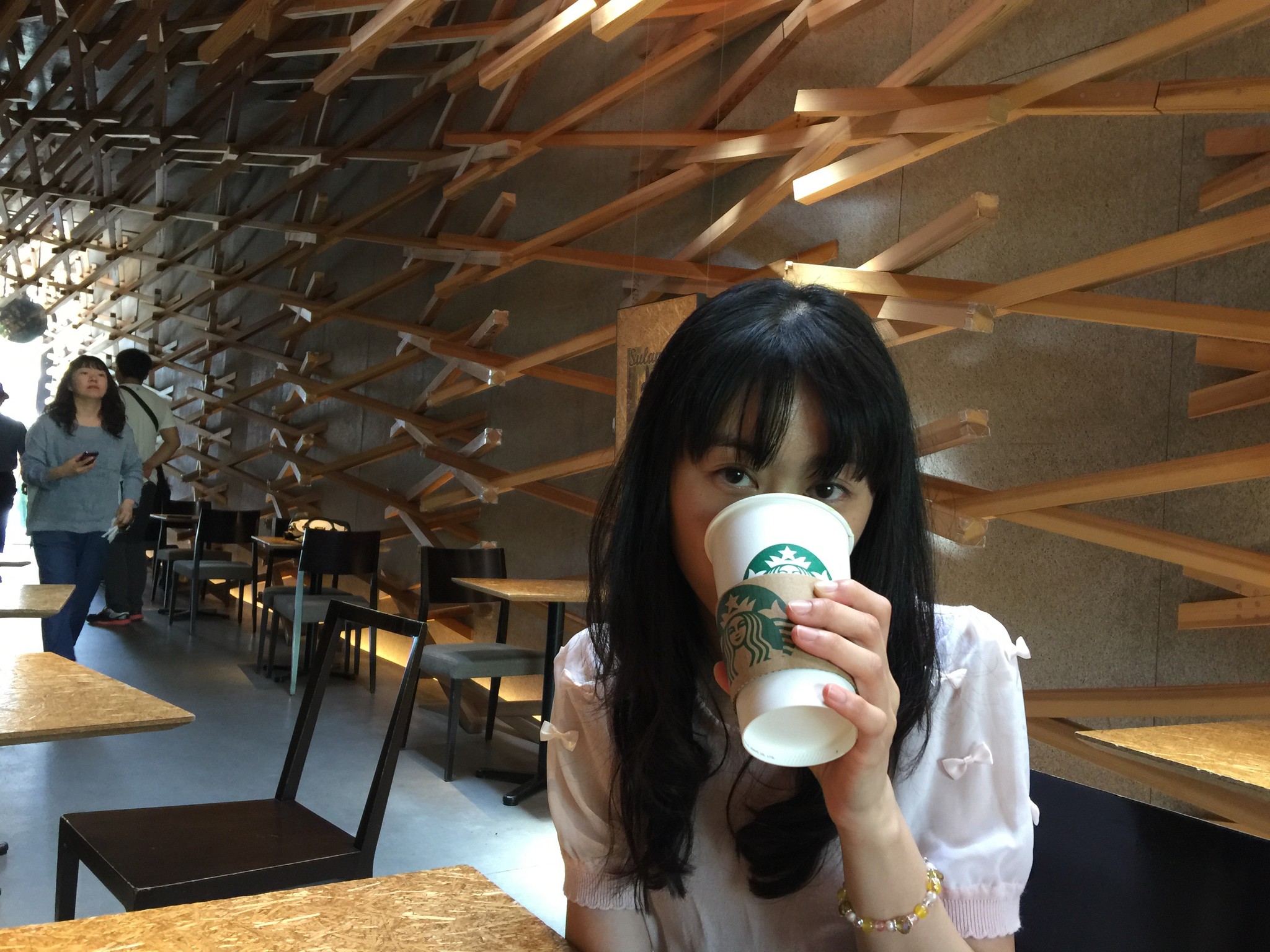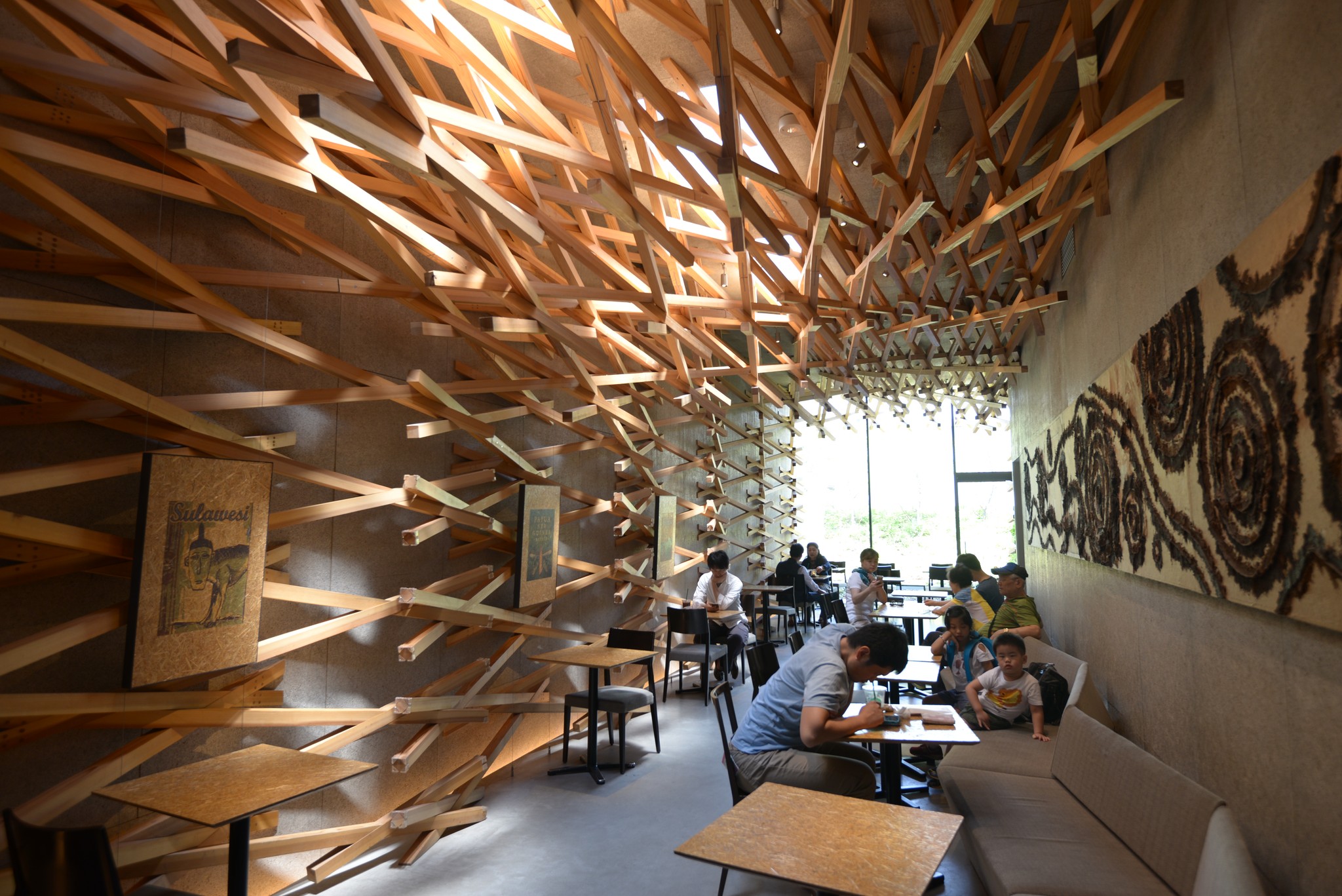 太宰府表參道上的另一個特別的點就是太宰府星巴克啦,這家星巴克是由知名的建築師隈研吾設計的,他的設計理念是利用大量的自然建材像是木頭或竹子等,再配合光線、空氣、水三大元素創造出禪意氣息,我特別喜歡木頭的建築,有一種很溫暖的感覺