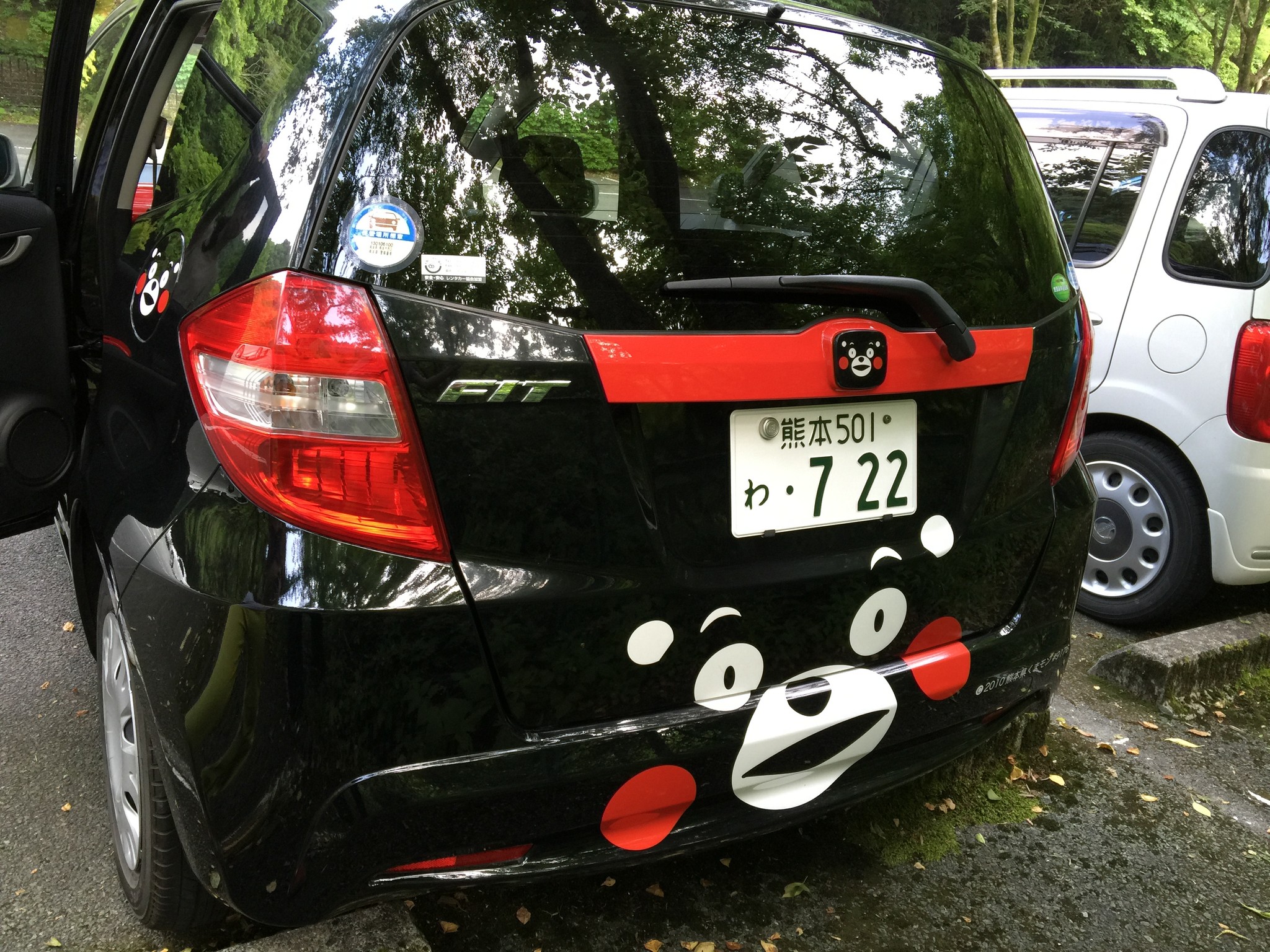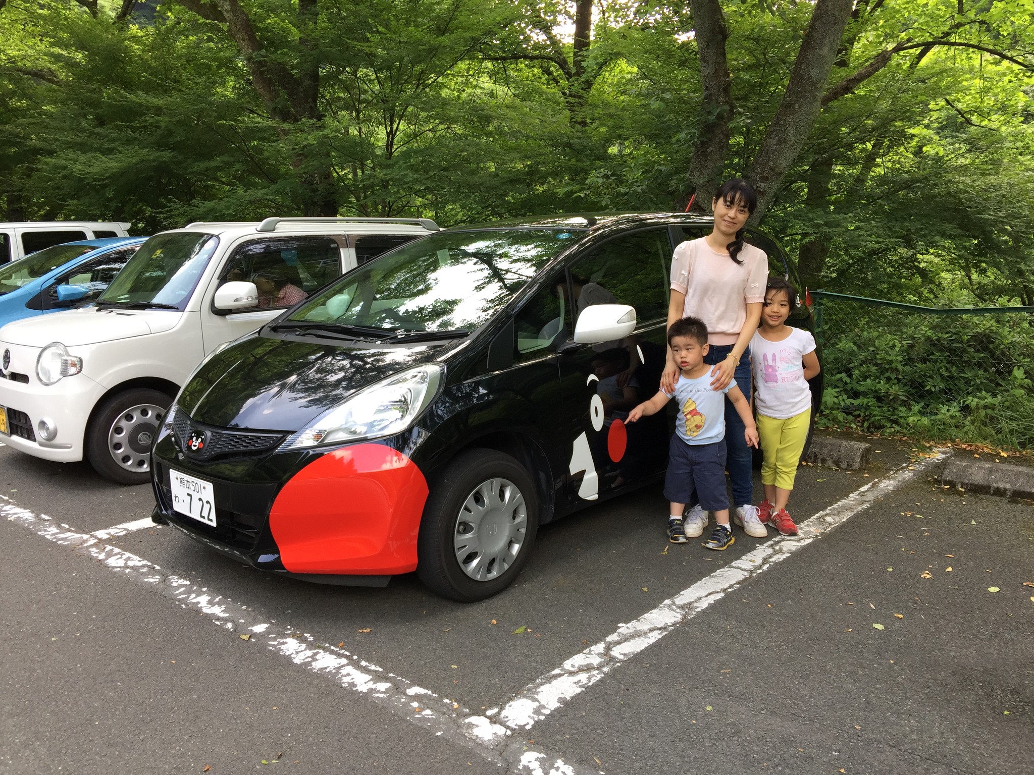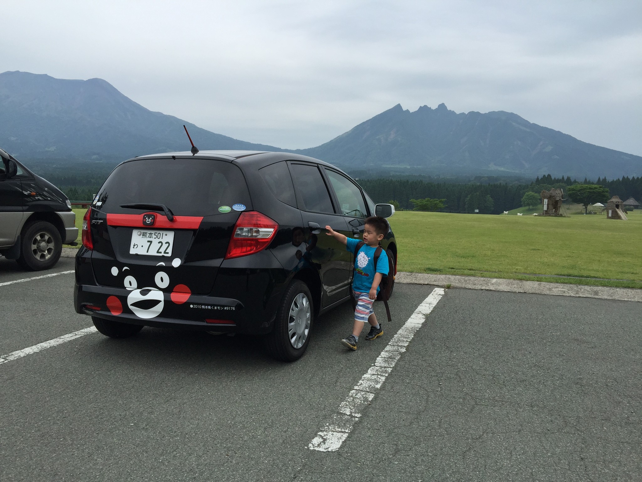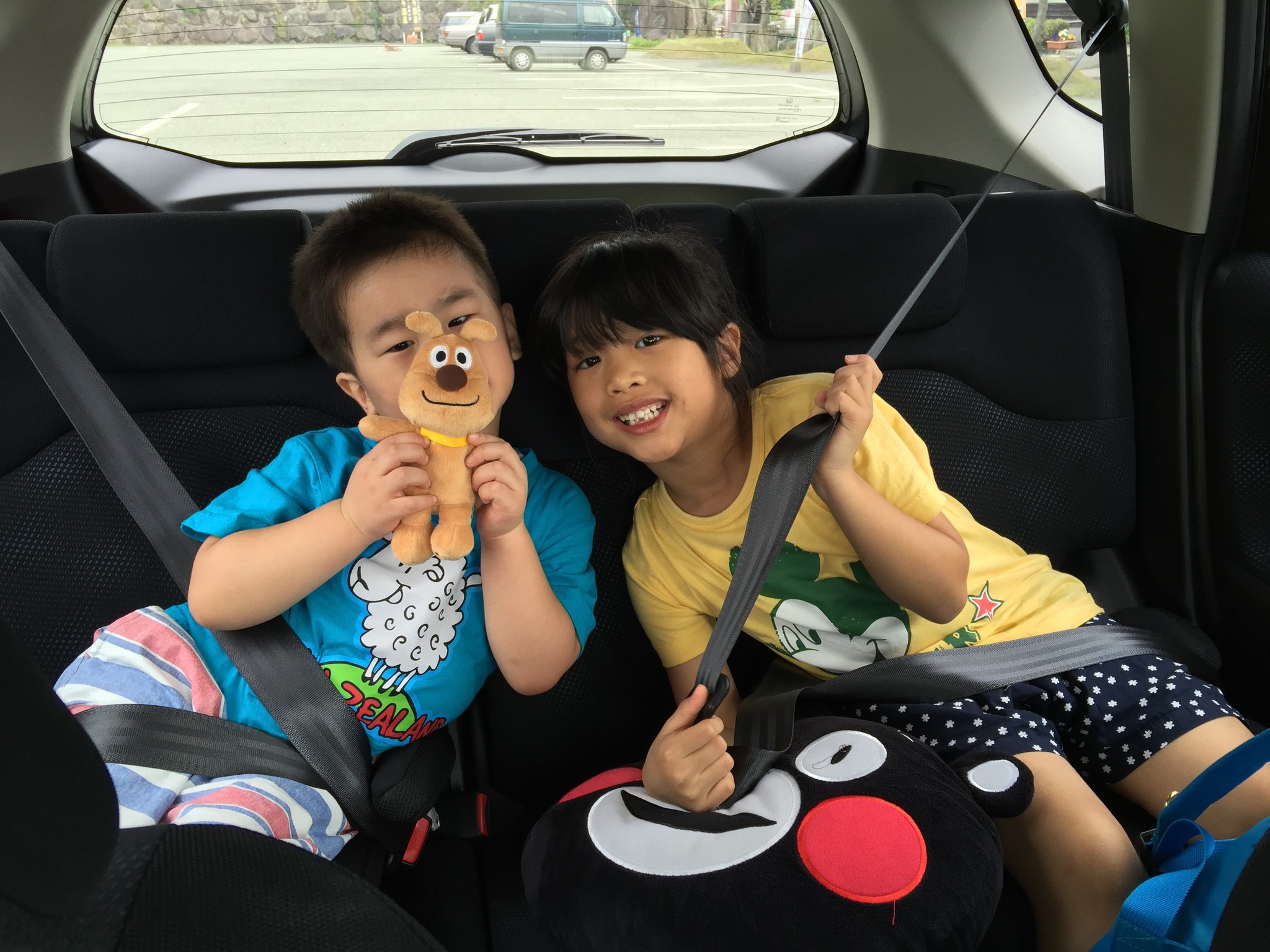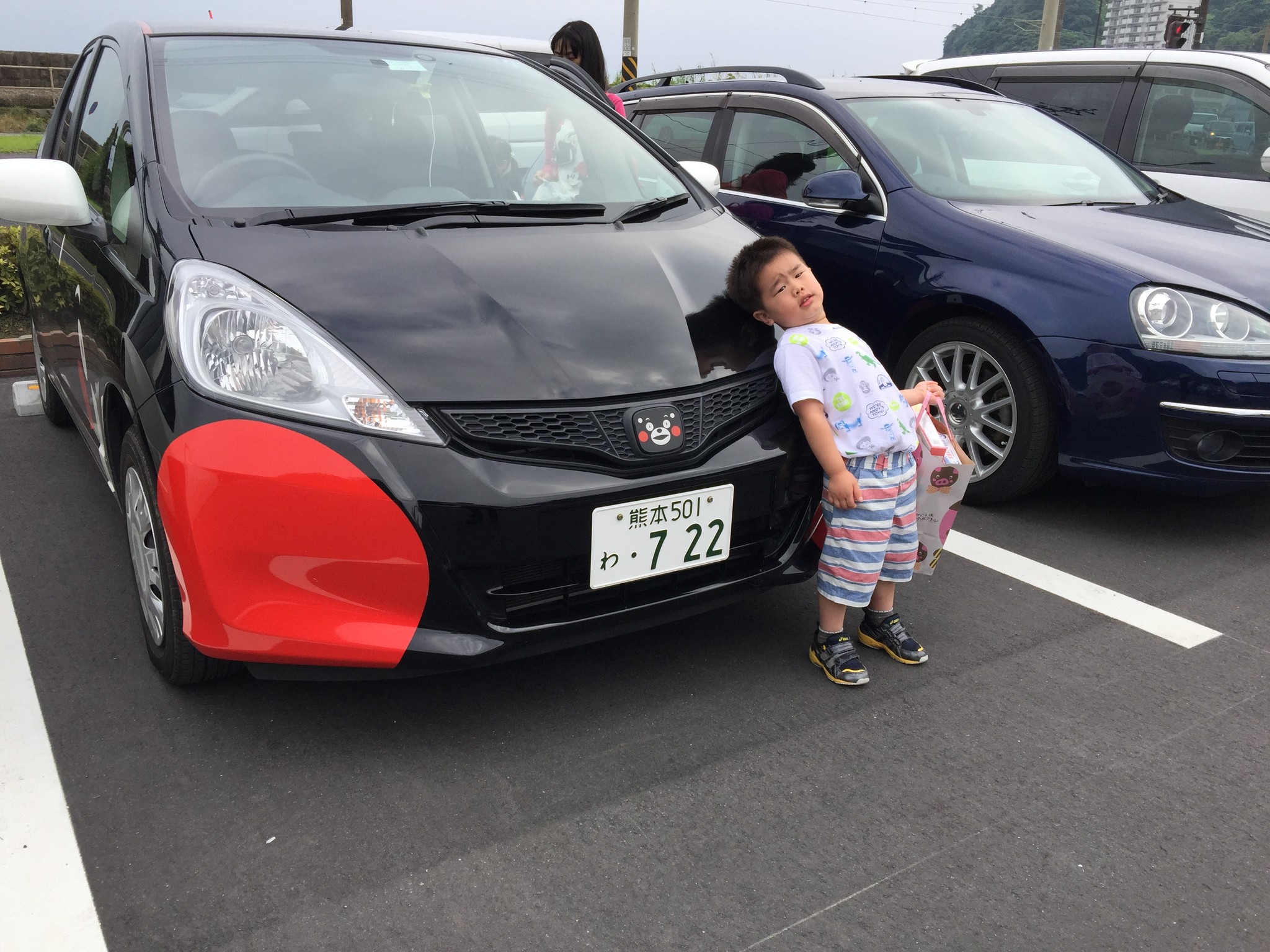 因為駅レンタカー九州的預約後續都是透過 e-mail 完成的,所以預約完的隔天,就知道有租到哭媽摸的車了。但為了給小朋友一個驚喜,所以拿到車前他們一直不知道我們租的是熊本熊的車,想當然看到車後驚叫聲此起彼落,這錢花得值得。