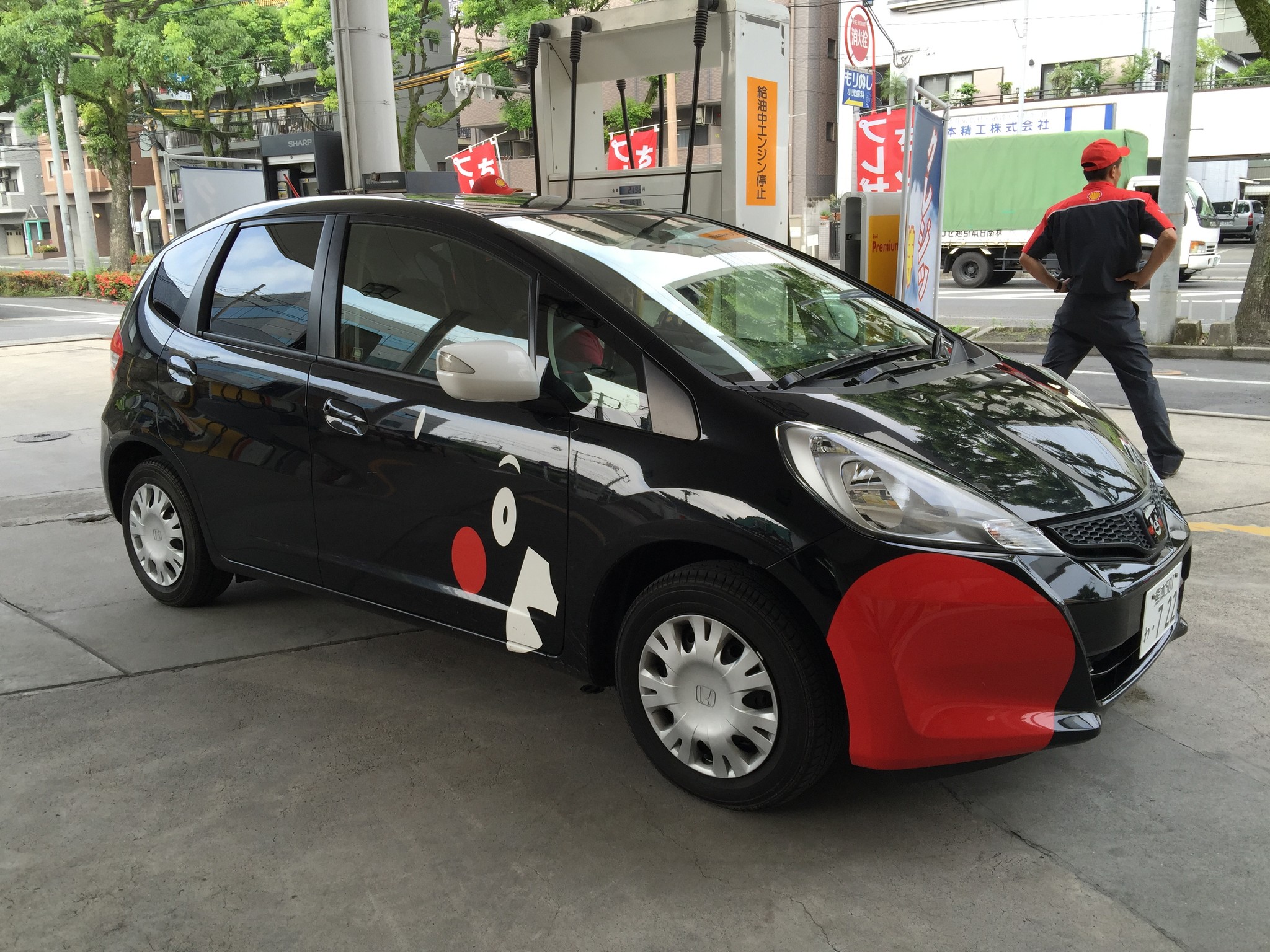 租到的這台是 Honda FIT,車子的外觀非常之醒目,再加上日本車子前座是不能貼隔熱紙的,要有一定的恥力才能從容駕馭。前方保桿有兩大圓圓紅紅的腮幫子、兩側前車門有哭媽摸的側臉、前後廠徽與後投保桿上有哭媽摸的臉,看起來改造還蠻容易的,有黑色 FIT 的車主可考慮考慮。